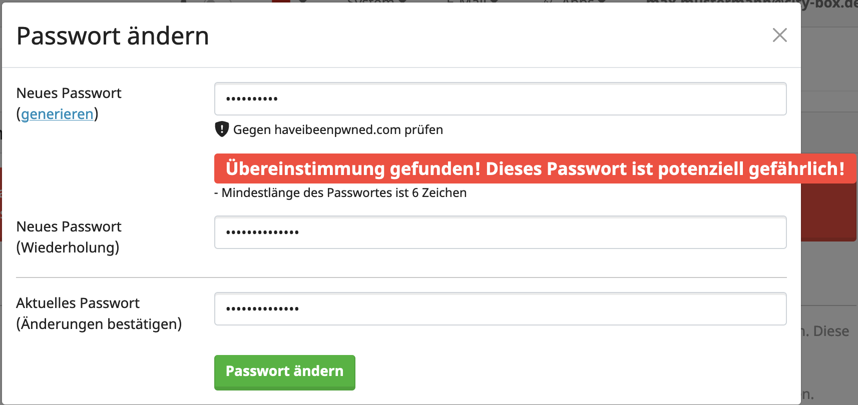 Sollte bei dem neuen Passwort wie in dem Bild her Hinweis "Übereinstimmung gefunden" ist, das eingebene Passwort nicht mehr geeigent !!! Danach den Dialog mit Passwort ändern verlassen.